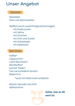 Unser Cafébetrieb wird ausschließlich von ehrenamtlichen Mitarbeitern getragen und lebt von Spenden. Frei nach dem Motto „Zahle, so viel es dir wert ist“ entscheidet jeder selbst, was ein Besuch bei uns kostet.